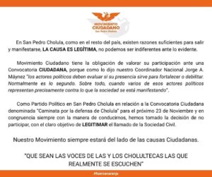 San Pedro Cholula, Pue.– Movimiento Ciudadano en San Pedro Cholula informó que no participará en la “Caminata por la Defensa de Cholula”, convocada por ciudadanos