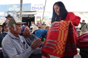 Ariadna Ayala encabeza entrega de cobijas en san pedro Benito Juárez en Atlixco