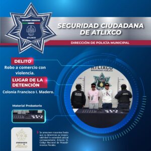 La Secretaría de Seguridad Ciudadana de Atlixco detuvo a dos hombres por su probable participación en el robo a un comercio en la colonia Francisco