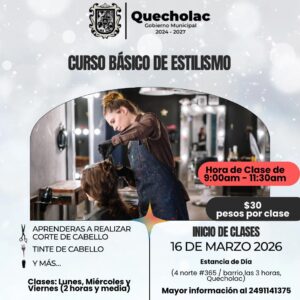 El Honorable Ayuntamiento de Quecholac que encabeza la Presidenta María Guadalupe Martínez Gerardo te invita al curso Básico de Estilismo. Se les hace la cordial