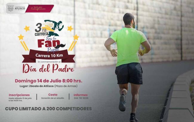 Por tercer año consecutivo, el Ayuntamiento de Atlixco que encabeza Ariadna Ayala, celebrará el Día del Padre con la carrera atlética, “Soy tu Fan Papá”.