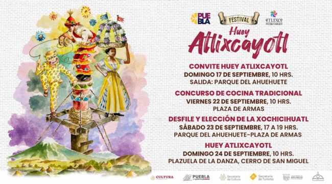 Por último, el domingo 24 de septiembre en la Plazuela de la Danza del cerro de San Miguel, tal y como la marca la tradición, en punto de las 10:00 de la mañana, autoridades estatales, municipales, acompañados de la Xochicíhuatl y sus Xochipilmes, inaugurarán una edición más del Festival Huey Atlixcayotl, donde a través de la danza y bailes, se busca preservar y fortalecer las costumbres, así como las tradiciones del Estado de Puebla. Consulta las redes sociales Atlixco Travel y Ayuntamiento de Atlixco para conocer más detalles.