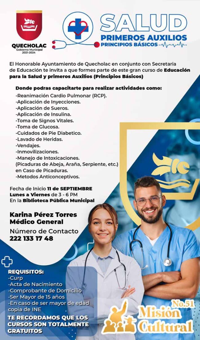 Este curso es totalmente gratuito para hombre y mujeres del municipio, que estén interesados en adentrarse en los principios básicos de la salud. Mismo que será impartido en la Biblioteca Pública Municipal Amado Nervo (Quecholac) de Lunes a Viernes de 3:00 p.m. a 6:00 p.m.