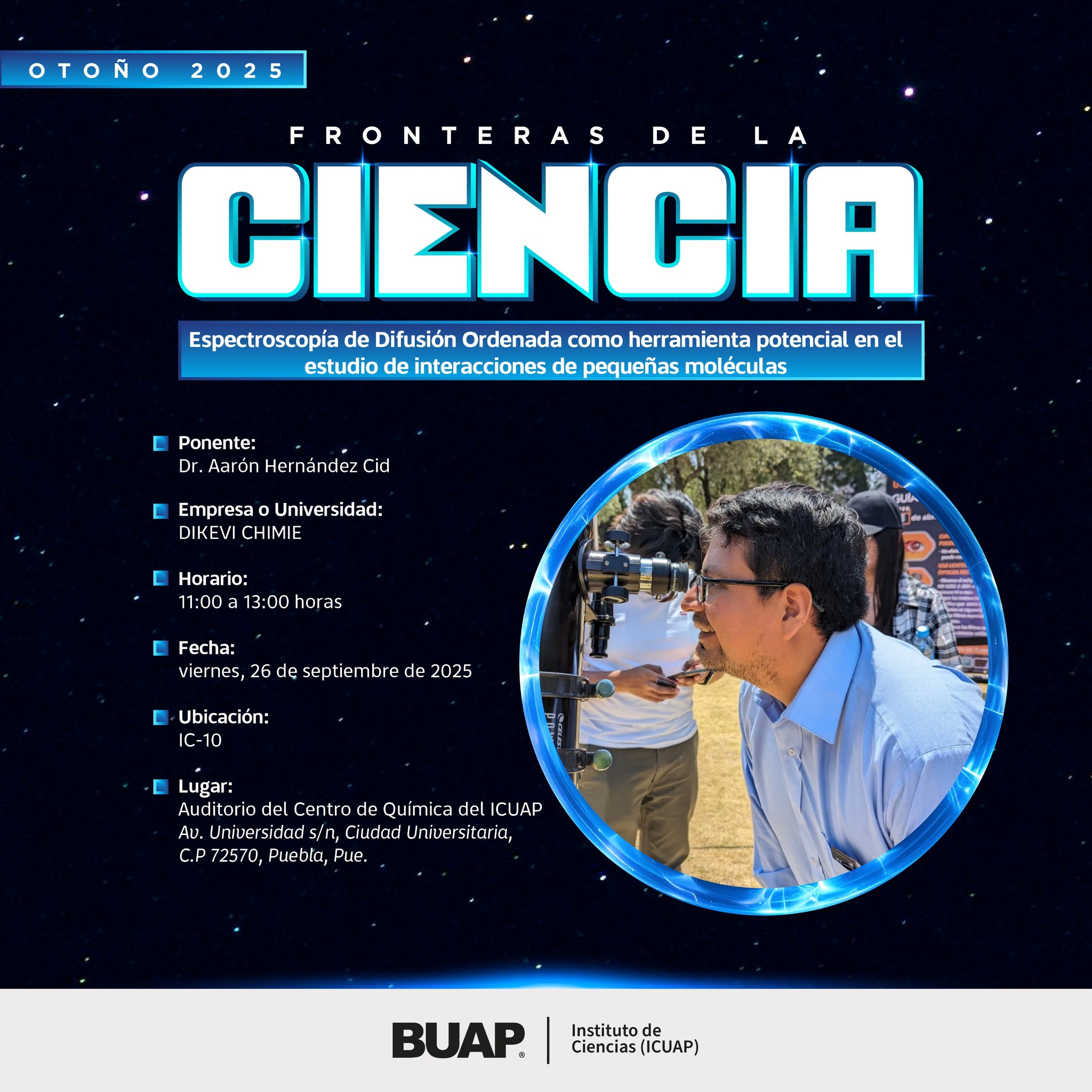 La BUAP convoca a la comunidad universitaria y científica a asistir a una interesante sesión del ciclo Fronteras de la Ciencia, titulada “Espectroscopía de Difusión Ordenada como herramienta potencial en el estudio de interacciones de pequeñas moléculas”, a cargo del Dr. Aarón Hernández Cid. Esta conferencia se llevará a cabo el 26 de septiembre de 2025, a las 11:00 horas, en el auditorio del Centro de Química del ICUAP.