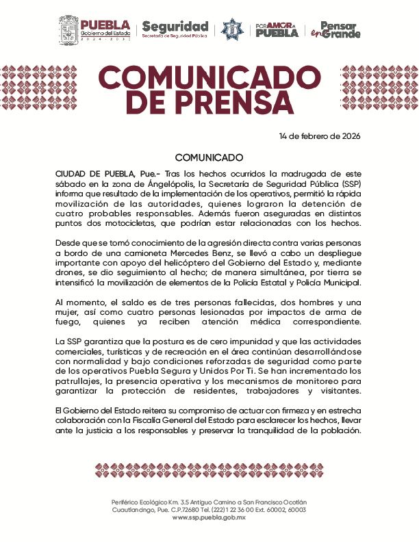 La SSP garantiza que la postura es de cero impunidad y que las actividades comerciales, turísticas y de recreación en el área continúan desarrollándose con normalidad y bajo condiciones reforzadas de seguridad como parte de los operativos Puebla Segura y Unidos Por Ti. Se han incrementado los patrullajes, la presencia operativa y los mecanismos de monitoreo para garantizar la protección de residentes, trabajadores y visitantes.