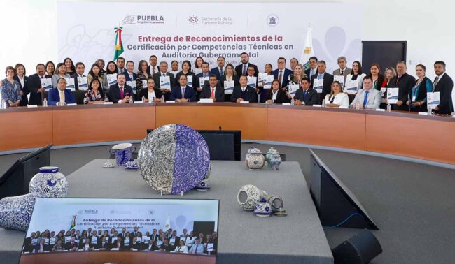 CIUDAD DE PUEBLA, Pue.- Para fortalecer el quehacer gubernamental, el combate a la corrupción y la transparencia, el gobierno de Puebla promueve la capacitación de servidoras y servidores públicos, puntualizó el gobernador Sergio Salomón al presidir la Entrega de reconocimientos de la certificación por competencias técnicas en auditoría gubernamental.