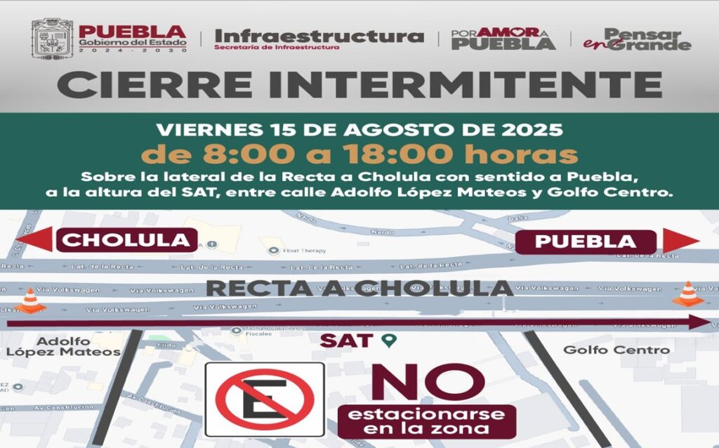 San Pedro Cholula, Pue.- Mucha atención, ya que este viernes 15 de agosto a partir de las 08:00 horas habrá cierre intermitente sobre la lateral de la Recta a Cholula con sentido a Puebla, a la altura del Servicio de Administración Tributaria (SAT).