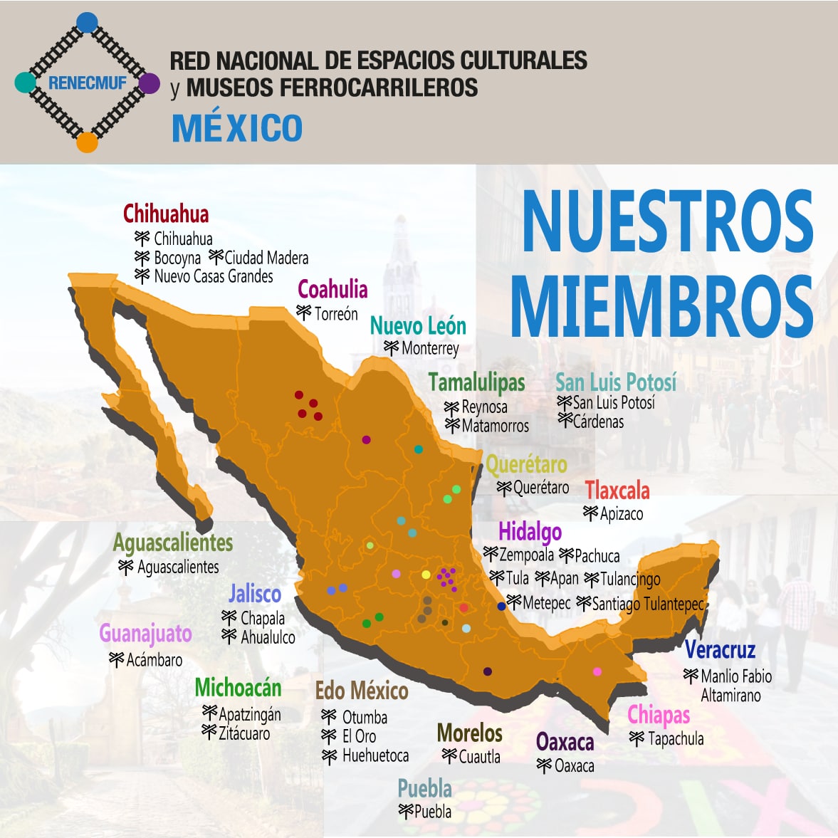 Estaciones, talleres y otros sitios ferrocarrileros en desuso, que han sido rescatados como museos, centros culturales, casas o salas de lectura, son miembros de esta red con presencia en Aguascalientes, Chiapas, Chihuahua, Coahuila, Estado de México, Guanajuato, Hidalgo, Jalisco, Michoacán, Morelos, Nuevo León, Oaxaca, Puebla, Querétaro, San Luis Potosí, Tamaulipas, Tlaxcala y Veracruz.