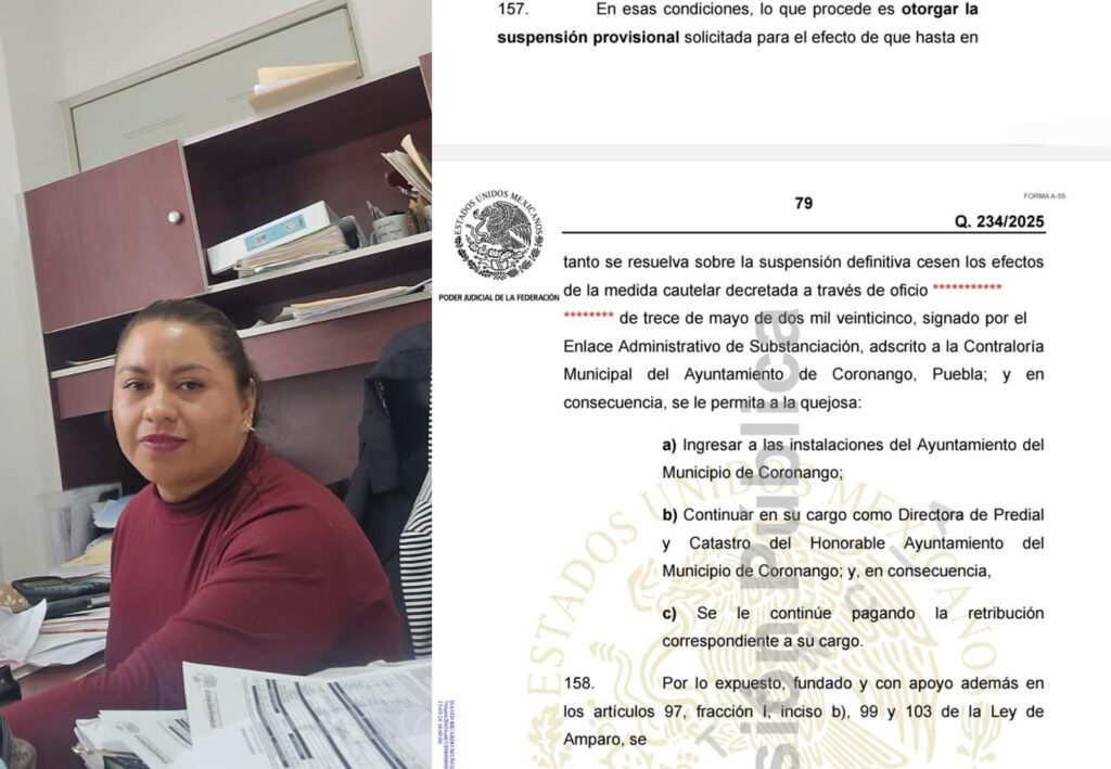 A decir de los inconformes, la C. Yasmin Aguirre ya había sido separada de su cargo, pero al parecer por un amparo que ganó fue que tuvieron que reinstalarla, el resolutivo de dicho amparo con fecha 04 de junio 2025, el cual con número de expediente Q. 234/2025 del Primer Tribunal Colegiado en Materia Administrativa del Sexto Circuito. La separación de su cargo por parte de la Contraloría municipal había sido determinada derivado de una auditoria realizada a la Dirección de Predial y Catastro donde se descubrió que la susodicha había desviado para su bolsillo más de 3 millones de pesos por conceptos de cobros de prediales. Dicha forma de operar del angelito era eliminando los adeudos de años anteriores para solo ingresar a las arcas del ayuntamiento el año corriente, de esta forma desfalcando los ingresos propios del ayuntamiento de Coronango.