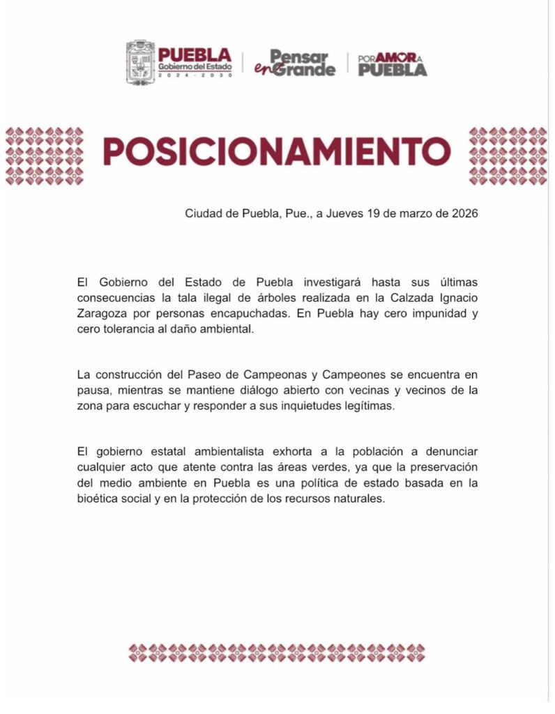 El Gobierno del Estado de Puebla investigará hasta sus últimas consecuencias la tala ilegal de árboles realizada en la Calzada Ignacio Zaragoza por personas encapuchadas.