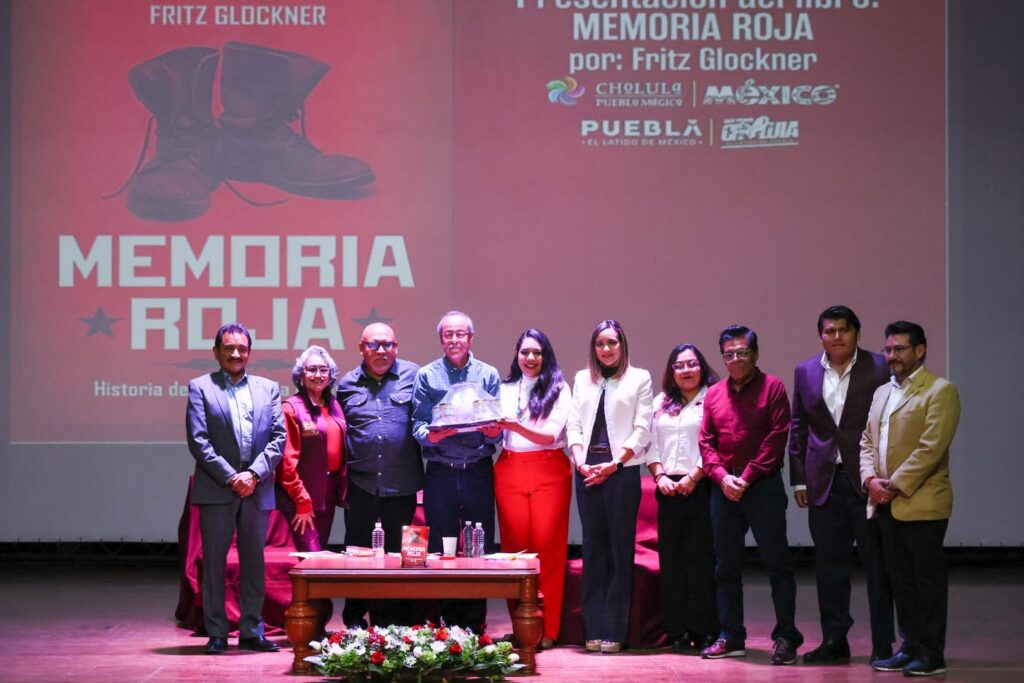 *16 de abril de 2026. San Pedro Cholula, Pue. –* Con el objetivo de promover la historia, la cultura y la lectura, el titular de la Secretaría de Cultura del estado, Fritz Glockner, presentó su libro Memoria Roja en el Teatro de la Ciudad Sagrada, en San Pedro Cholula, acompañado por la presidenta municipal, Tonantzin Fernández.
