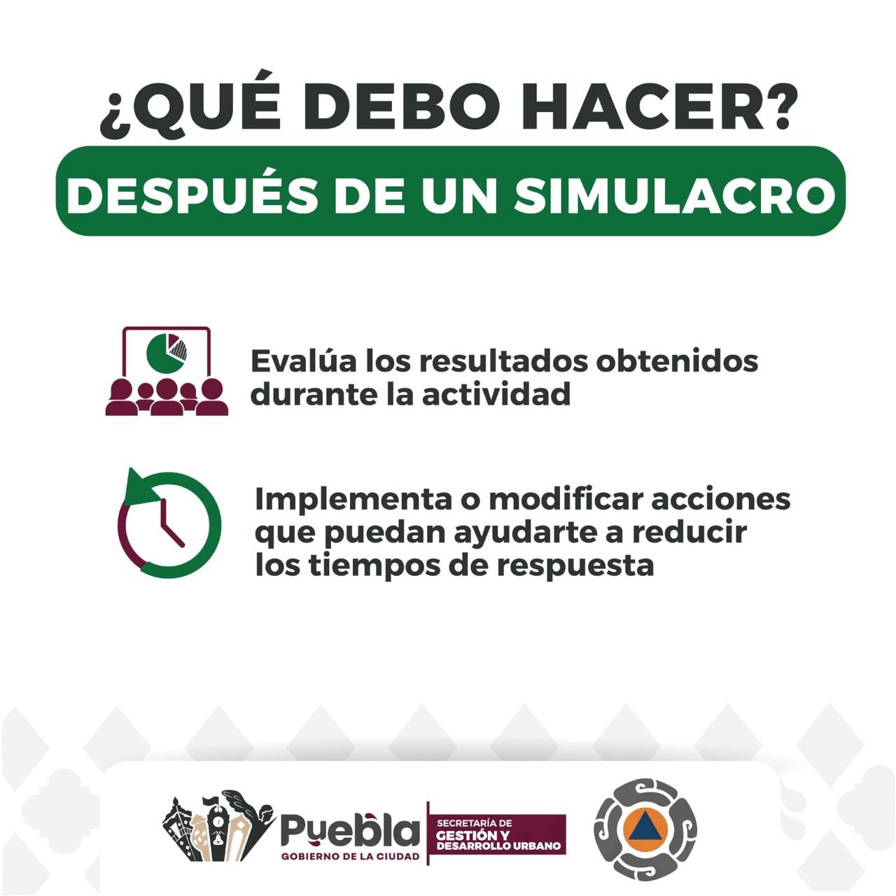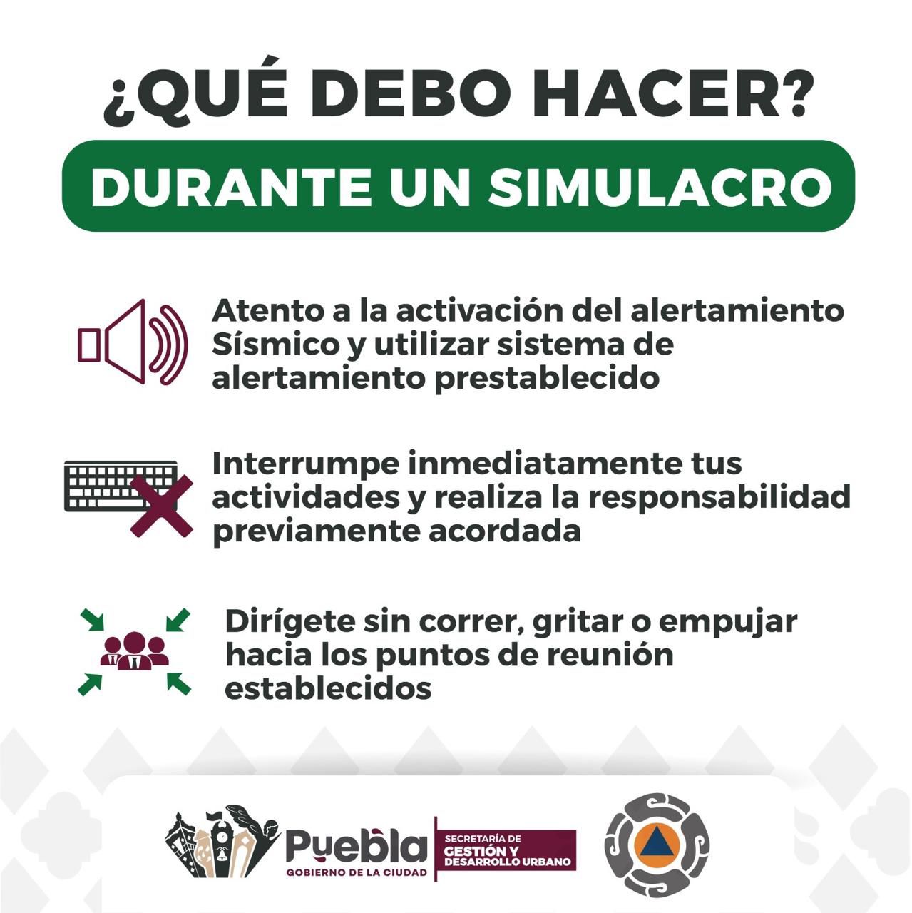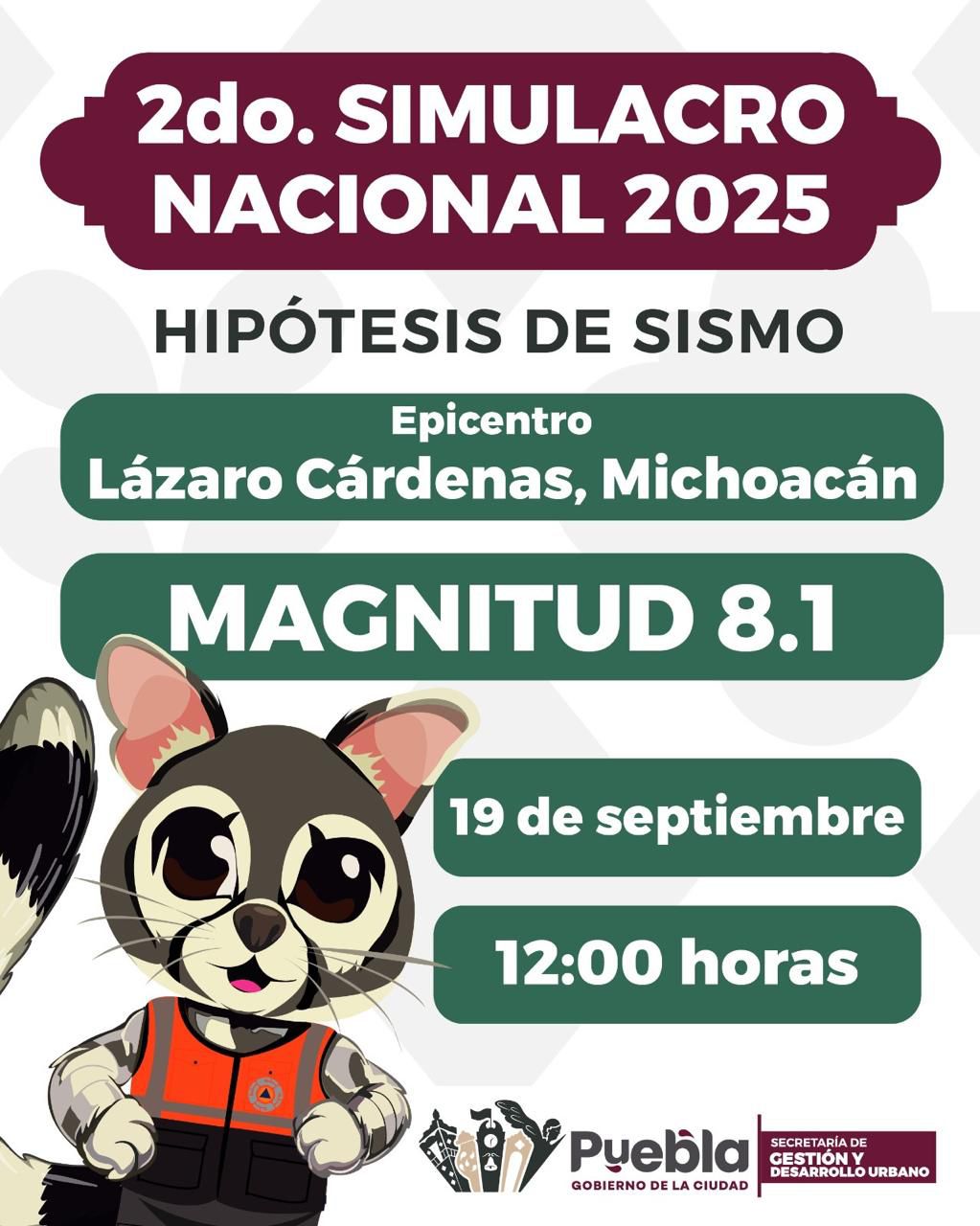 Puebla, Pue., 24 de agosto de 2025.- El Gobierno de la Ciudad informa a la ciudadanía que este próximo 19 de septiembre a las 12:00 horas, se llevará a cabo el 2do. Simulacro Nacional 2025. Este ejercicio se realizará bajo la hipótesis de un sismo de magnitud 8.1, con epicentro en Lázaro Cárdenas, Michoacán, y forma parte de las acciones preventivas para fortalecer la cultura de la protección civil en la capital.