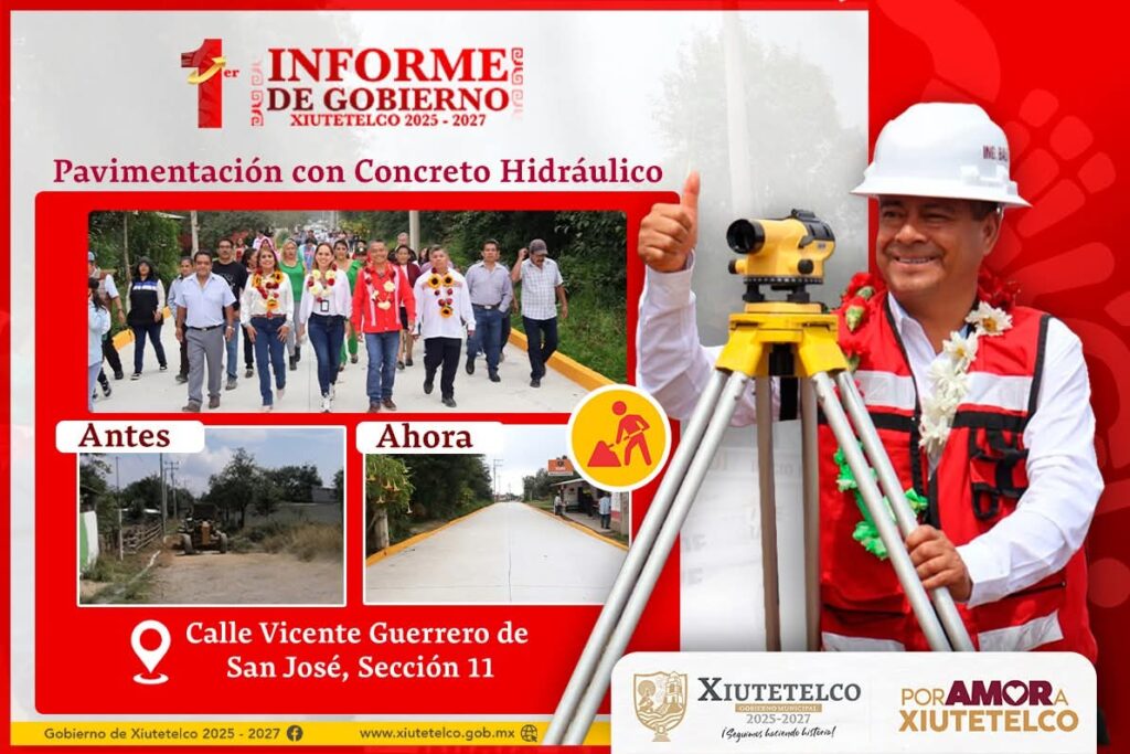 Entre las primeras acciones, destaca la construcción de pavimento hidráulico en la calle Vicente Guerrero de San José, sección 11, con más de 900 metros lineales, una obra que mejora la movilidad y fortalece la infraestructura de la comunidad.