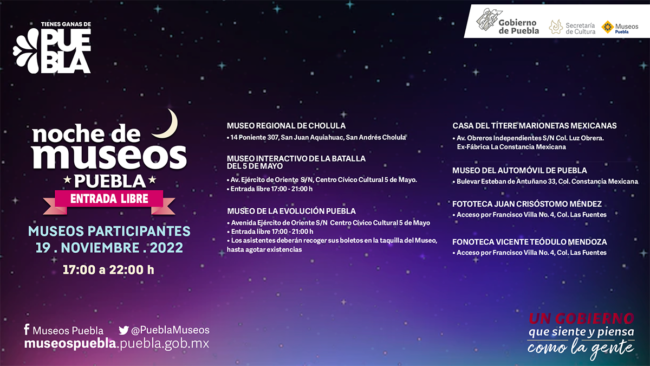 Para consultar más información sobre las diferentes actividades, están disponibles las redes sociales: Facebook (Museos Puebla y Secretaría de Cultura Puebla) y Twitter (@PueblaMuseos y @CulturaGobPue), así como la página http://sc.puebla.gob.mx/.