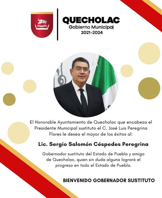 El Honorable de Quecholac que encabeza el Presidente Municipal sustituto el C. José Luis Peregrina Flores felicita al Gobernador sustituto el Lic. Sergio Salomón Céspedes Peregrina y le deseamos el mayor de los éxitos.