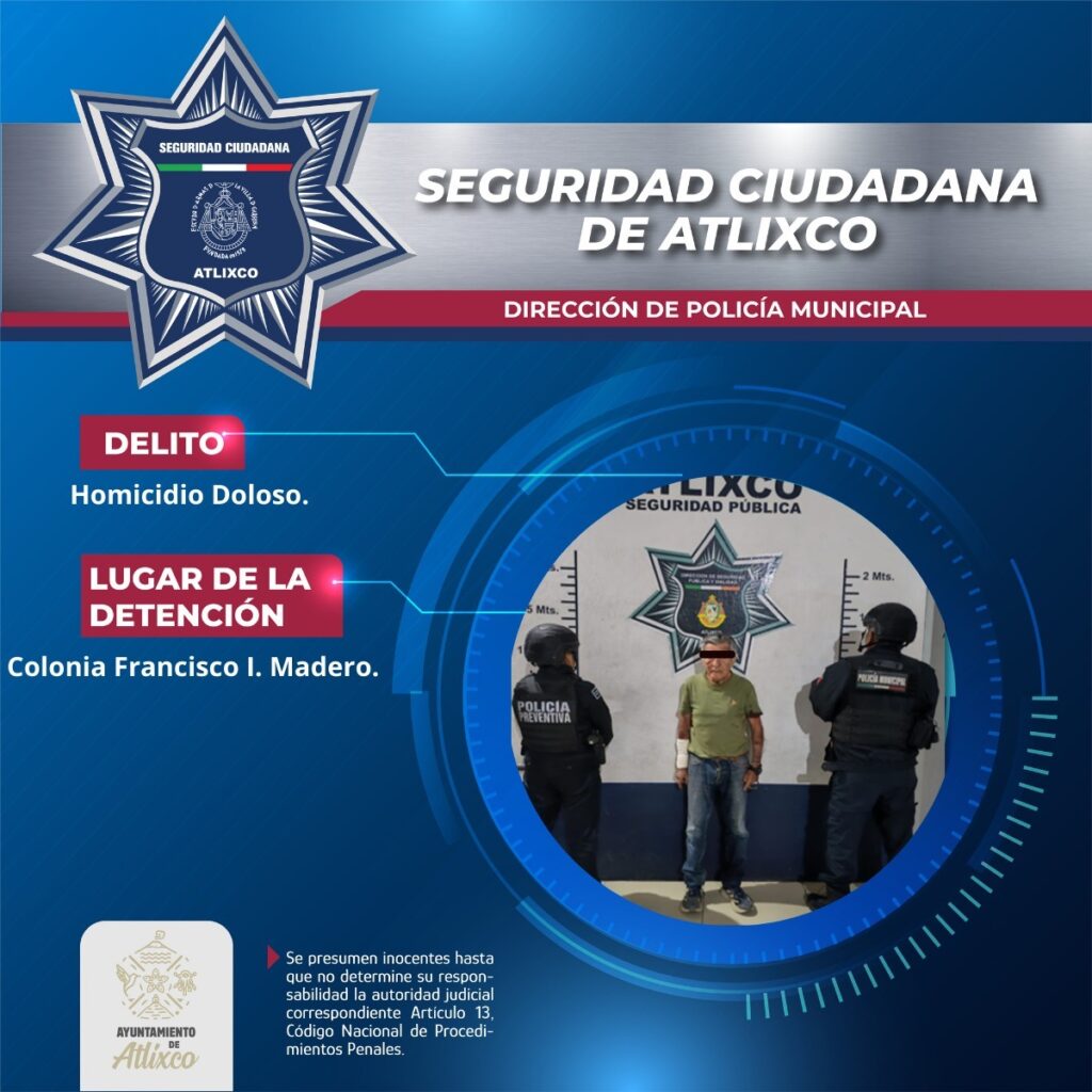 Elementos de la Secretaría de Seguridad Ciudadana de Atlixco detuvieron a un masculino por su probable participación en homicidio doloso en la colonia Francisco I. Madero.